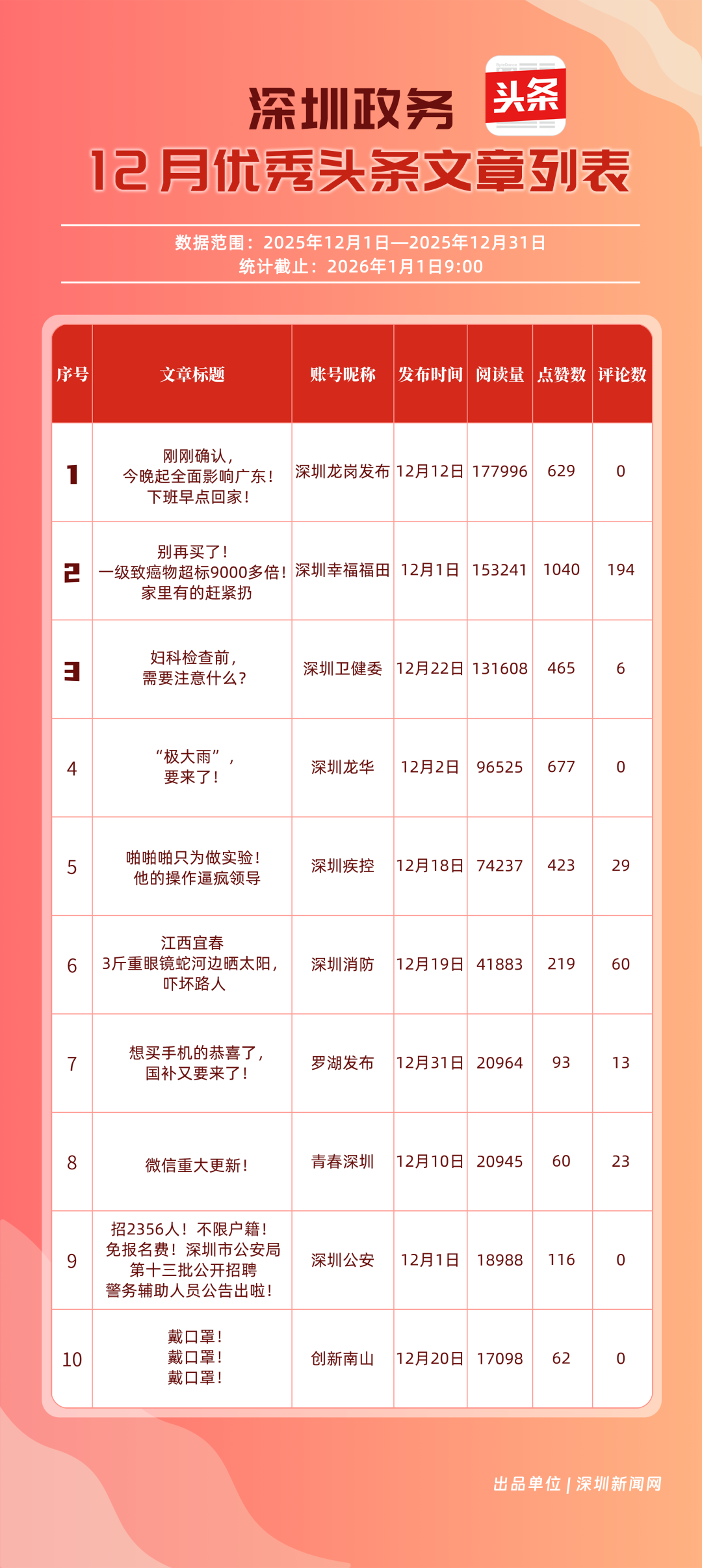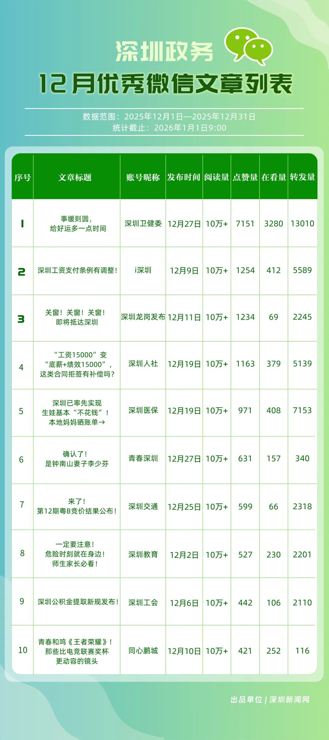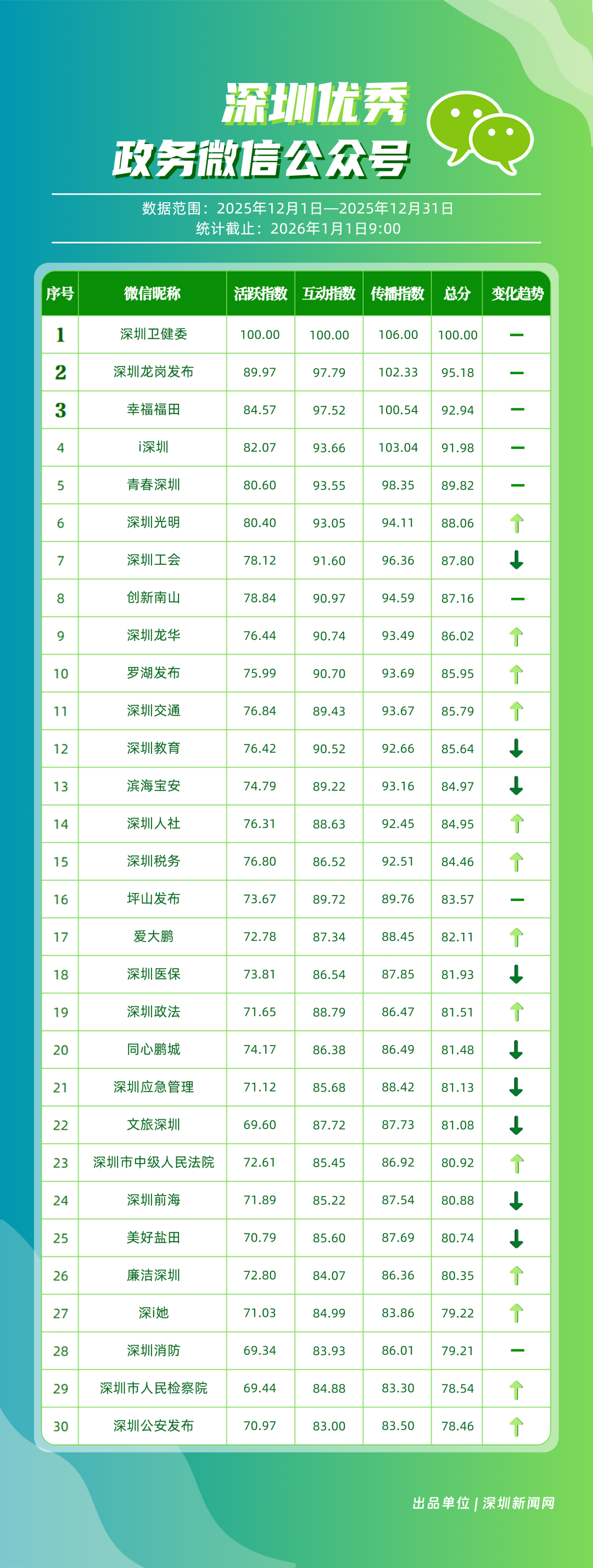 12月,“深圳衛(wèi)健委”“深圳龍崗發(fā)布”“幸福福田”“i深圳”“青春深圳”“深圳光明”“深圳工會(huì)”“創(chuàng)新南山”“深圳龍華”“羅湖發(fā)布”等30個(gè)政務(wù)微信公眾號(hào)榮登“深圳優(yōu)秀政務(wù)微信公眾號(hào)”榜單。12月榜單中,頭部政務(wù)賬號(hào)優(yōu)勢(shì)穩(wěn)固,腰部賬號(hào)競(jìng)爭(zhēng)激烈。“深圳衛(wèi)健委”延續(xù)強(qiáng)勁表現(xiàn),在活躍、互動(dòng)、傳播維度均斬獲滿分,60余篇文章閱讀超10萬(wàn),蟬聯(lián)榜首;“深圳龍崗發(fā)布”在互動(dòng)、傳播方面表現(xiàn)亮眼,穩(wěn)居榜單第二;“幸福福田”也在互動(dòng)、傳播方面具備一定優(yōu)勢(shì),以穩(wěn)定的內(nèi)容輸出與用戶口碑,居于榜單第三?!吧钲诠饷鳌薄吧钲邶埲A”“羅湖發(fā)布”等政務(wù)賬號(hào)不斷拓展信息發(fā)布維度、深化服務(wù)場(chǎng)景打造,排名較上期有所提升。上榜微信公眾號(hào)以高質(zhì)量?jī)?nèi)容為核心競(jìng)爭(zhēng)力,在政務(wù)傳播賽道持續(xù)發(fā)力,為推動(dòng)政務(wù)信息公開、服務(wù)民生需求搭建了高效的溝通橋梁。