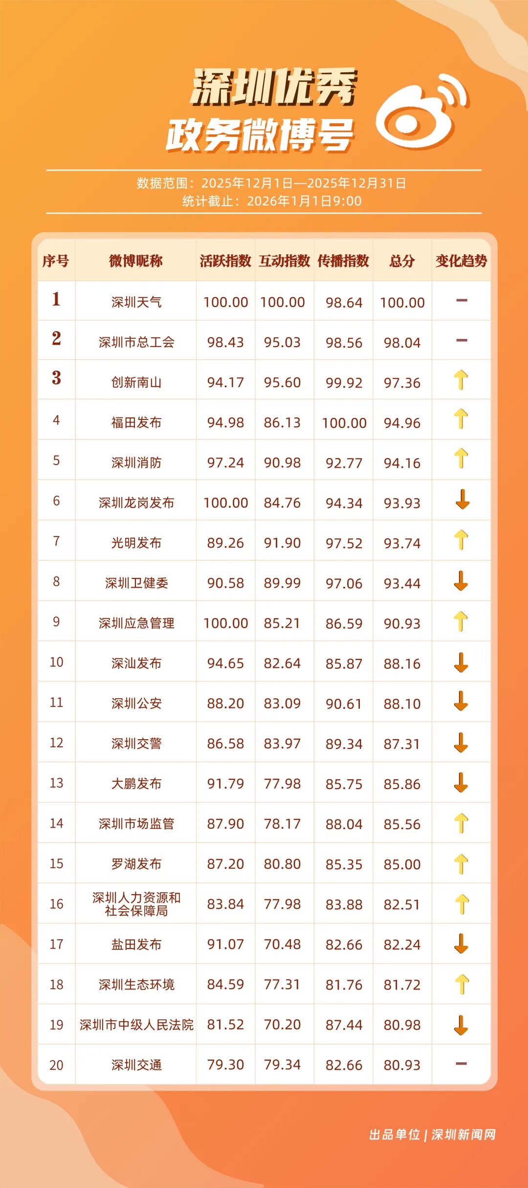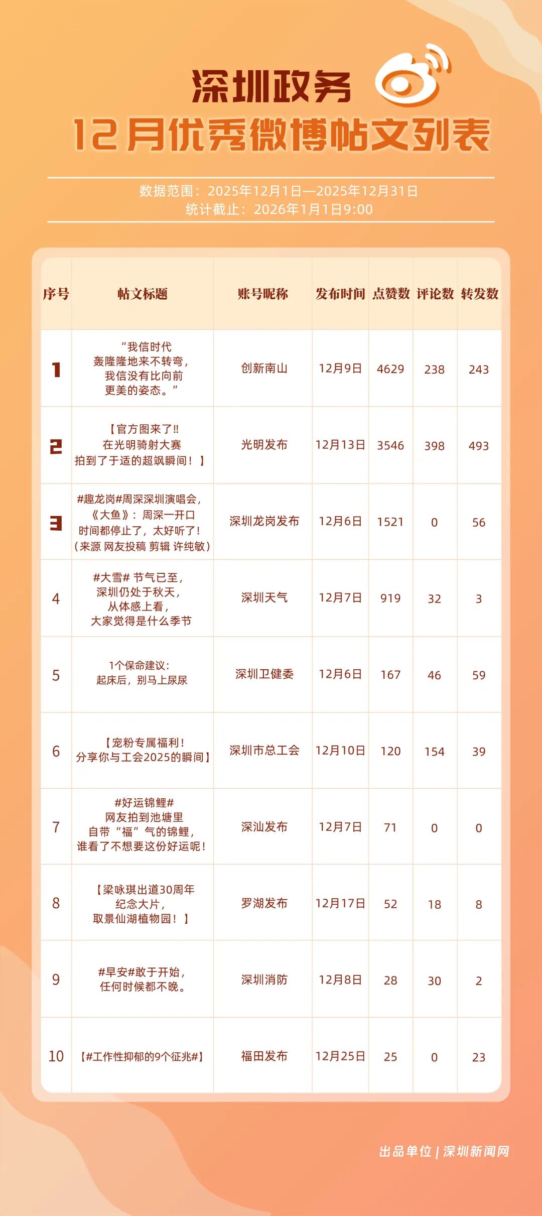 12月,20個(gè)賬號(hào)入選“優(yōu)秀政務(wù)微博號(hào)”榜單,其中包括:“深圳天氣”“深圳市總工會(huì)”“創(chuàng)新南山”“福田發(fā)布”“深圳消防”“深圳龍崗發(fā)布”“光明發(fā)布”“深圳衛(wèi)健委”“深圳應(yīng)急管理”“深汕發(fā)布”等。其中,“深圳天氣”精準(zhǔn)化發(fā)布天氣信息,高頻次與網(wǎng)民互動(dòng),以滿分成績(jī)蟬聯(lián)榜首,彰顯其在民生服務(wù)領(lǐng)域的核心價(jià)值;“深圳市總工會(huì)”積極發(fā)布互動(dòng)、福利類內(nèi)容,獲得較高用戶參與度與賬號(hào)影響力,居于榜單第二;“創(chuàng)新南山”傳播指數(shù)得分超99分,躋身榜單第三?!案L锇l(fā)布”“深圳消防”等賬號(hào)聚焦民生熱點(diǎn)、強(qiáng)化互動(dòng)運(yùn)營(yíng),居于榜單前列,且排名有所提升。12月上榜政務(wù)微博賬號(hào)持續(xù)發(fā)力,實(shí)現(xiàn)了政務(wù)信息的有效傳播,為政務(wù)新媒體的內(nèi)容運(yùn)營(yíng)與價(jià)值傳遞提供了可借鑒的實(shí)踐樣本。