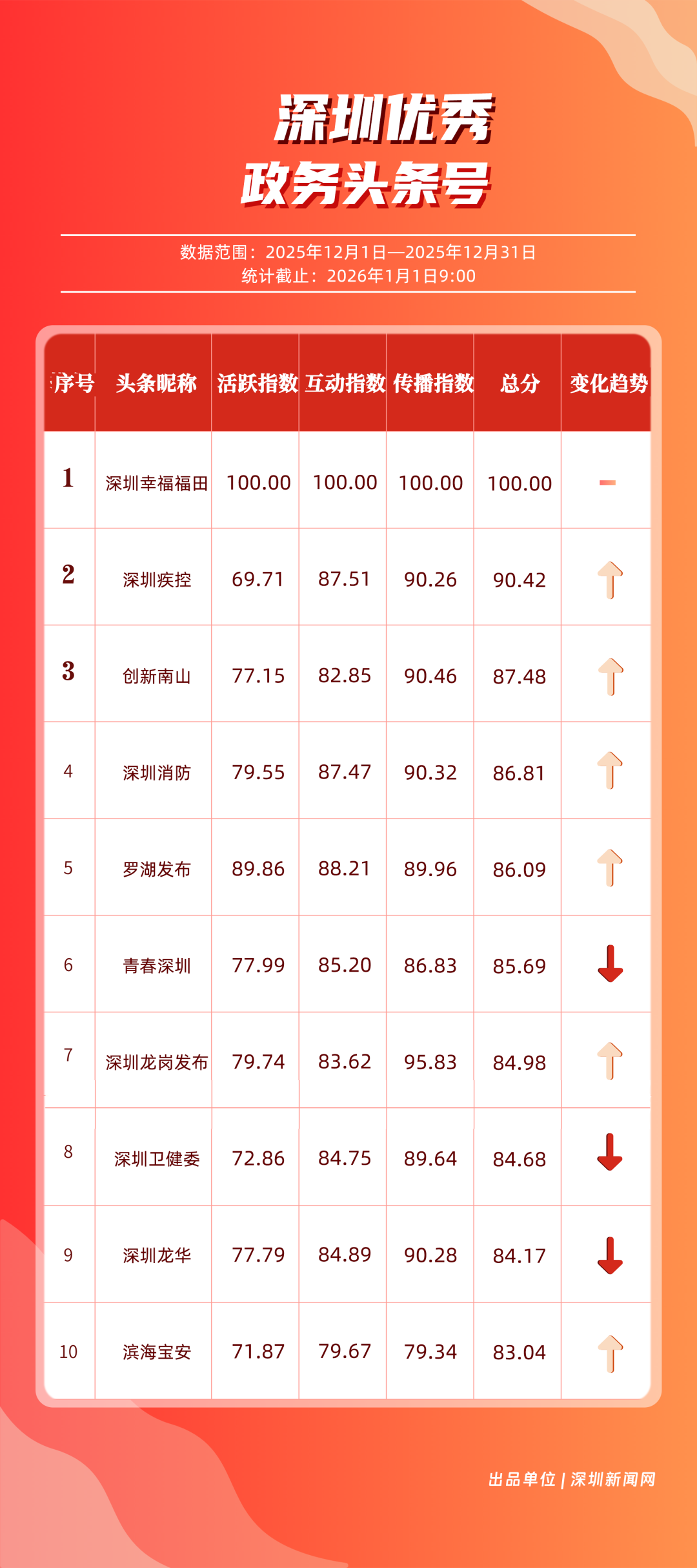 12月,“深圳幸福福田”“深圳疾控”“創(chuàng)新南山”“深圳消防”“羅湖發(fā)布”“青春深圳”“深圳龍崗發(fā)布”“深圳衛(wèi)健委”“深圳龍華”“濱海寶安”共10個(gè)政務(wù)頭條號(hào)入選“優(yōu)秀政務(wù)頭條號(hào)”榜單。12月,“深圳幸福福田”今日頭條文章總閱讀量超百萬(wàn),彰顯出強(qiáng)大的政務(wù)傳播力,位居榜首;“深圳疾控”積極發(fā)布信息科普、健康提示類專業(yè)內(nèi)容,排名躍居第二;“創(chuàng)新南山”以多元內(nèi)容吸引關(guān)注,排名上升至第三位?!吧钲谙馈薄傲_湖發(fā)布”“青春深圳”得分在85分以上,緊隨第一梯隊(duì)。上榜政務(wù)頭條號(hào)以群眾需求為出發(fā)點(diǎn),通過(guò)多元內(nèi)容形式,構(gòu)建起政務(wù)信息與市民生活的緊密連接。