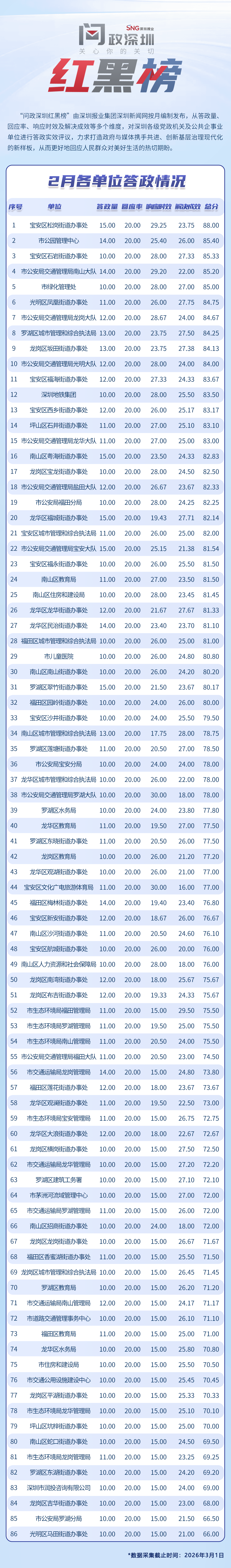 “問政深圳紅黑榜”具有科學(xué)、合理、完備的綜合評價體系,能夠綜合評估深圳各級黨政機關(guān)和公共企事業(yè)單位的答政情況。