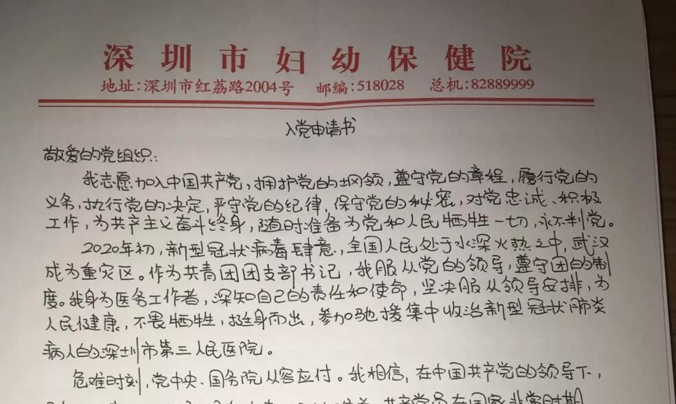 • 陳浠在戰(zhàn)“疫”一線寫(xiě)的入黨申請(qǐng)書(shū)